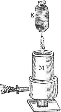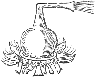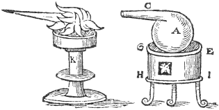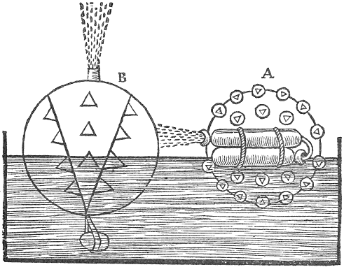 Let there be a round vessell of glasse, or horn, and on the top of it a vessell of brasse, and in the midst a hollow pipe spreading it selfe into foure seuerall branches at the bottom: the ends of two of the branches must turn up, the ends also of two must turn down; upon these foure branches fasten a light cord, with seuerall images set upon it. Rarifie the ayre then by laying a red-hot iron upon the top of the brasse or tin vessell, and it will turn the wheele about, so that you would think the images to bee living creatures.
