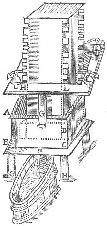 Prepare a vessell after the forme of the figure marked with the letters A, B, C, D, place it upon a frame, as F, G, H; this vessell must have a hole in the bottom, with a pipe fastned in it, as Q, to convay the water conteyned in it into a vessell or tub set under it, marked with the letters R, S, T, also a frame must bee fastned at the top of it, as G, H, L, having so many bels with little beaters or hammers to them (artificially hanged) as are requisit to expresse your desired tune. Lastly provide a sollid peece of timber, whose lower part must bee fitted unto the aforesayd vessell, so that it may easily slip up and down, and so high as that its foot resting upon the bottom of the vessell, the upper part thereof may stand somewhat above all the bels. Note likewise that that part of this wood aboue its bottom or foot must be cut away about three quarters of an inch. Vpon this wood thus fitted must bee fastned severall pins equall unto each bell, from the top unto the foot thereof, so disposed that they may orderly presse down the inward ends of the hammers of each bell, according as the tune goeth: when you use it, fill the cestern almost with water, and put the fitted peece of timber into it, and as the water runneth out at the bottom, it will play upon the bels: note that it were very requisit to haue a cock fastned to the pipe on the bottom of the vessell, that therewith you might at your pleasure stay the water. The like engines might be made to play upon wyer strings disposed upon a concavous water, to make the musick resound, but because this description giueth light enough for the framing of diuers other, I thought good here to omit them.