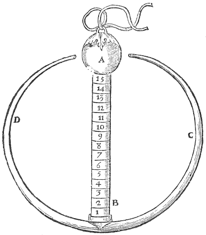 First prepare the glasse A, B, fill it almost top-full of water, provide also the glasse K, L, having a loop at the top of it: divide it into so many equall parts as you would haue degrees, and on the mouth thereof fasten a thin board, that will easily slip in and out of the bottom glasse, make then a waight of lead or brasse somewhat heavier than both the glasse and board fastned thereto; and then tie a little rope to the loop of the glasse A, B, and the waight at the other end thereof. Rarify the ayre contained in the glasse L, and reverse it into the glasse A, B, filled with water, and hang the plummet over two little pulleys fastned in a frame made for the purpose, and as the glasse K, L, cooleth, the water will ascend the same, and so by the change of the outward both the glasse and water will move accordingly.