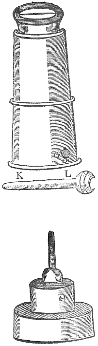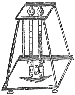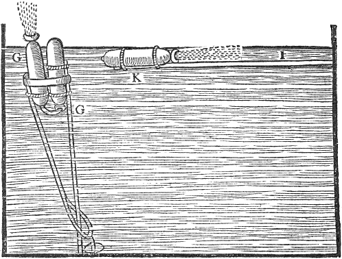 Prepare two glasses like unto the figure marked with the letters A, B, the one of them must have a small hole in or about the head thereof. Prepare likewise for the bottom a vessell of the fashion of the figure G, H, having two mouthes, at each end one, also a cocke in the middle, as K: divide then the shank of the glasse without the hole in the top, into equall parts, and set figures upon it: next lute them both fast into the necks of the bottom vessell. (But first remember to put them in a frame:) when the cement is dry turn the cock of the bottom vessell, and rarify the ayre in the glasse that hath no hole at the top; then set the bottom vessell a little way into a vessell filled with water, and it will suck up the water as it cooleth, when the bottom vessell is full, also the water mounted in that top glasse without a vent, up to a fitting degree; (the temper of the weather regarded) then depresse (but gently) the glasses into the vessell of water, untill the water be come up into the glasse with the vent at the top sufficiently, that is, so that in both the glasses may bee contained so much water as will fill the shank of one, and about 2 or 3 degrees of the other; then turne the cock, and take away the vessell of water from under them, let them down, and fasten the bottom vessell unto the bottom of the frame, and make a rock about it, or else what other works you please, that the art may not be discerned. Lastly, set figures upon both, but first upon that without the vent, beginning from the bottom, and proceeding upwards, then lay your hand upon the head of it, which will depresse the water, which when it commeth equall to the degrees, paste the same degree on the place of the water in the other glasse with the vent, and it is done.