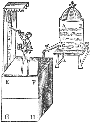 Prepare a vessell, as A, B, C, D, having a very small cock unto it, whose passage ought to bee so small, as that the water might issue out but by drops. Prepare likewise a vessell, as E, F, G, H, having at one end of it a piller of a foot and a halfe, or two foot high: let there be fitted unto this vessell a board, so that it may freely without stay, slip up and down: towards one side of this board, there must be a good big hole, which must bee placed under the cock of the other vessell. Then fasten unto the top of this board, the image of Time or Death, and pointing with a dart upon the piller aforesaid: turn then an houre glasse, and at the end of every houre make a figure on the place of the piller that the image with his dart pointeth at, and it is made. For note, the dropping of the water out of the cock thorow the hole of the board whereon the image standeth, causeth the same to ascend by little and little. Mark the figures.