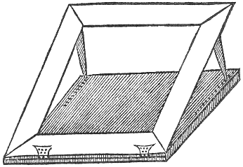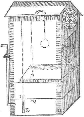 First prepare a cestern, as A, B, C, D, partition in the middle, let there bee made two pipes, the one whereof must reach out of the upper cestern, and descend almost to the bottom of the lowest cestern, as I, K; the other must be a short one, and haue a very small hole, that the water may thereby issue out of the upper cestern but by drops; also at the side nigh the bottom of the upper cestern, let a small pipe enter. To the upper cestern fit a board, (with a peece of lead nayled upon it to make it somewhat heavy) so that it may easily slip up and downe in it; this board must haue a loop to fasten a rope unto, and you must so poyse the said board, that it being hung up by a line, may hang even, and levell. Then prepare a box to put ouer the cestern, which ought to stand about six inches aboue the cestern. In the top of this box let there be fastned a long pulley with a creuice to put a small rope ouer, in this creuice it were fitting to fasten small pins, to the end that the rope might turn the sayd wheele as the water faleth from under the board: let the spindle of this pulley come out at one side of the box whereon there is a Dyall drawn, contayning so many houres as you would haue it go for; unto this end of the spindle let there bee fitted a needle, or director, to shew the houre, then put a small cord ouer the pulley in the box, fasten one end thereof to the loop of the board, and at the other end let there bee tied a waight not quite so heauy as the board, then fill the upper cestern with water, and the board will presse it out into the lower vessell, at the pipe O, drop by drop, and as the board sinketh lower, it will by meanes of the rope upon the pulley, turne the index fastned unto the spindle of the pulley about the dyall; you may set it by an houre-glasse or Watch: when it is quite downe, if you doe with your mouth blow into the pipe at the side of the cestern, the water will all mount up againe into the upper cestern.