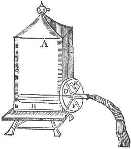 Let A, B, be a tub hauing in the bottom a brasse barrell, with a hole open quite through one side of it: let D, E, F, be a wheele, whose spindle must bee also hollow, and haue a hole through one side of it, so that being put into the hollow barrell, both the holes may be equall together. Note then, that so long as these holes are equall together, the water will run out at the spindle of the tub, but if you turne the wheele to another side, it will not run.