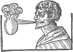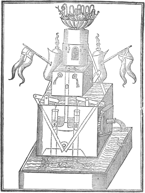 Prepare a cestern having within on the lid fastned a concave hemisphere, in whose bottom let there bee made one or two holes: let there also be a hole in the top of the sayd cestern, whereby it may bee filled with water as occasion serveth. Also let there bee made to stand on the top of this cestern the image of a man holding unto his mouth a trumpet: this image must likewise have a slender pipe coming out of the cestern unto the trumpet, in this pipe or cane there must be a cock, nigh unto the cestern. Also there must come out of the concave hemisphere at the side of the cestern, a little short pipe, having a clack on it within the vessell. Fill the cestern about two thirds full of water, and then cork it up fast, blow then into the vessell at the pipe on the side divers times, and the ayer will force the water out of the hemisphere, and make it rise up on the sides of it; turne then the cock, and the weight of the water will force the ayer out of the pipe, and so cause the trumpet to sound.
