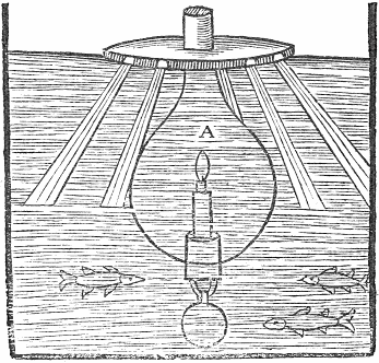 Let A, B, C, D, be a great vessell, having a partition in the middle: let there bee a large tunnell at the top of it, E, F, whose neck must go into the bottom almost of the lower vessell: let there be a hollow pipe also coming out of the partition, and almost touch the top of the upper vessell. In the top of the upper vessell let there bee another pipe, reaching from the bottom of the upper vessell, and extending it selfe out of the vessell a good way: let the top of it hang ouer the tunnell. In the top of the upper vessell let there be a hole besides, to be stopped with cork, or otherwise: when you will use it, open the cork-hole, and fill the upper vessel with water: then stop it close againe, and poure water into the tunnell, and you shall see that the water in the upper vessell will run out of the pipe into the tunnell againe and so will continue running untill all the water in the upper vessell be run out. The reason thereof is this; the water in the tunnell pressing the ayre in the lower vessell, maketh it ascend the pipe in the partition, and presse the water in the upper vessell, which having no other way but the pipe, it runneth out thereat.