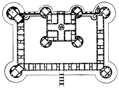 The Château, only the north part of which is completed, consists of two square blocks, the larger of which, five hundred and twelve feet long by three hundred and eighty-five feet broad, encloses the smaller in such a way, that the northern façade of the one forms the centre of the northern façade of the other. The corners of each block terminate in massive round towers, with conical roofs crowned by lanterns, so that four of these towers appear in the principal façade. In plan it will be seen that Chambord resembles the typical French château; with the habitation of the seigneur and his family in the centre, and this habitation enclosed on three sides by a court, while like most feudal dwellings, the central donjon shares one of its sides with the exterior of the whole. The central part is adorned with an unexampled profusion of dormer-windows, turrets, carved chimneys and pinnacles, besides innumerable mouldings and sculptures, above all of which rises the double lantern of the tower containing the principal staircase.