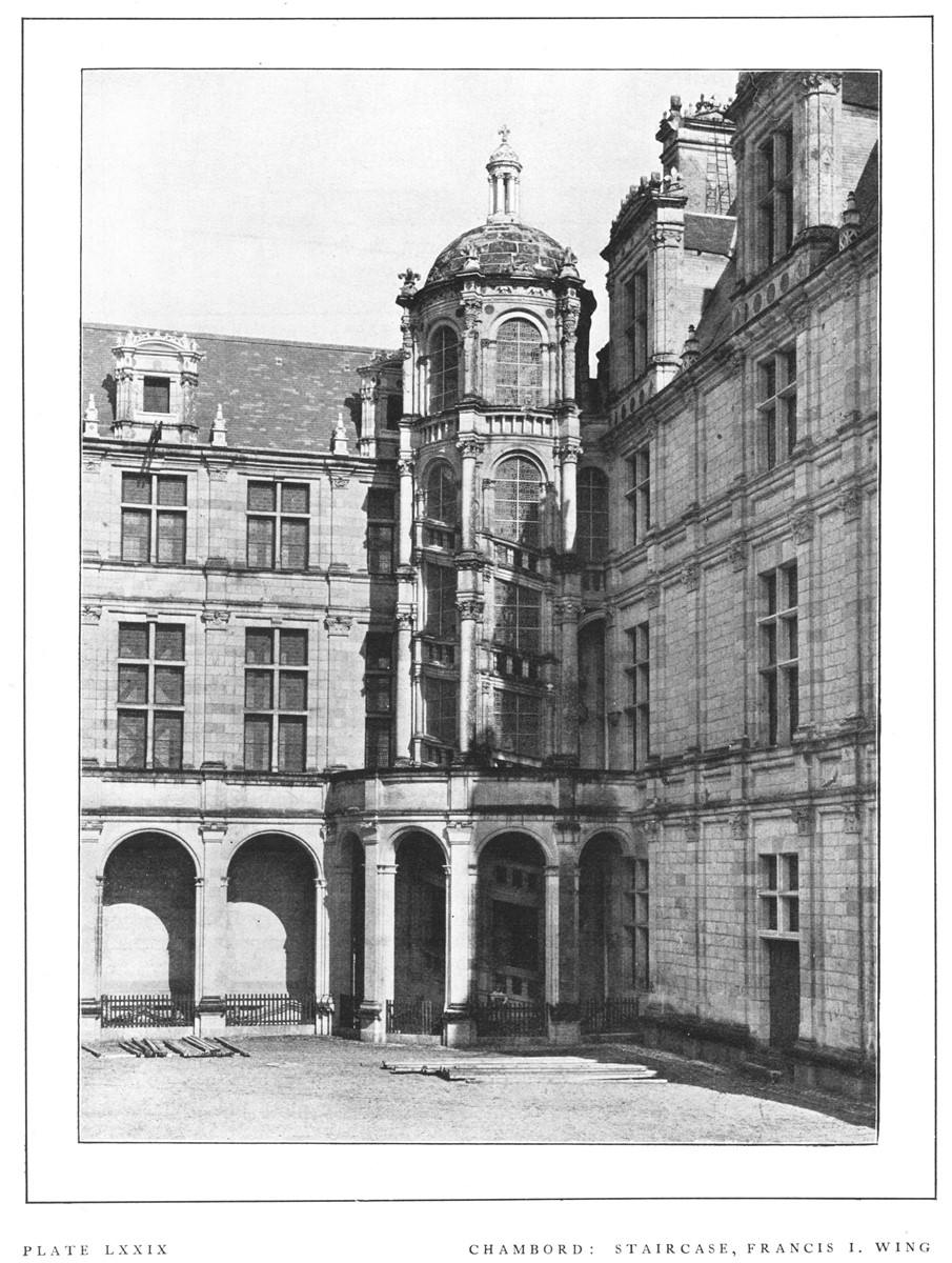 "Chambord is, indeed, throughout truly typical of the earlier stage of the new Renaissance movement. In the general arrangement, in the ordonnance, late Gothic caprice and fantastic love of the unforeseen rule triumphant. The older portions of the Château, the seemingly irregular assemblages of half Oriental turrets and spires, are debased Gothic, full of audacious disregard of all outward seeming of order. The architect, instead of seeking to bring home to the eye the general law, the plan on which the whole is grouped, has wilfully obscured and concealed it beneath the obviousness of the wild and daring conceits heaped above.