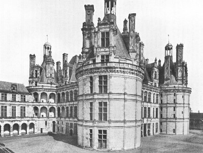 "With a sympathetic denial of any extreme over-technical admiration," writes Mr. Cook in his Old Touraine, "Viollet le Duc gives just that intelligible account of the Château which is a compromise between the unmeaning adulation of its contemporary critics and the ignorance of the casual traveller. 'Chambord,' says he, 'must be taken for what it is; for an attempt of the architect to reconcile the methods of two opposite principles,—to unite in one building the fortified castle of the Middle Ages and the pleasure-palace of the sixteenth century.' Granted that the attempt was an absurd one, it must be remembered that the Renaissance was but just beginning in France; Gothic art seemed out of date, yet none other had established itself to take its place. In literature, in morals, as in architecture, this particular phase in the civilization of the time was evident, and if only this transition period is realized in all its meanings, with all the 'monstrous and inform' characteristics that were inevitably a part of it, the mystery of this strange sixteenth century in France is half explained."
