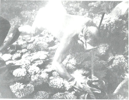 Skin-diving biologist collecting giant clam from coral bottom of Bikini Lagoon in the Pacific Ocean.