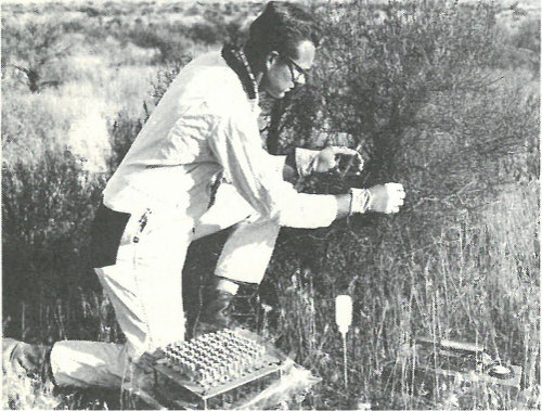 DESERT. Zoologist examines an animal trap as part of a field ecological study of a Nevada nuclear test site.