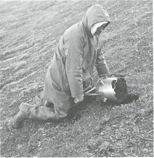 Placing equipment to measure fallout in precipitation north of the Arctic Circle in Alaska.