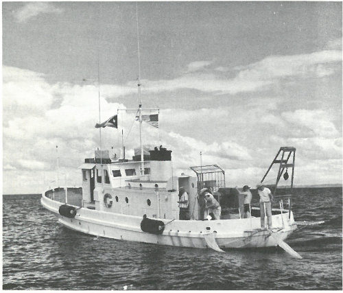 Oceanographers bringing aboard a 50-gallon seawater sampler from the ocean depths find it a difficult task, even in moderate seas. This photo was taken aboard the R. V. Crawford in the Atlantic.