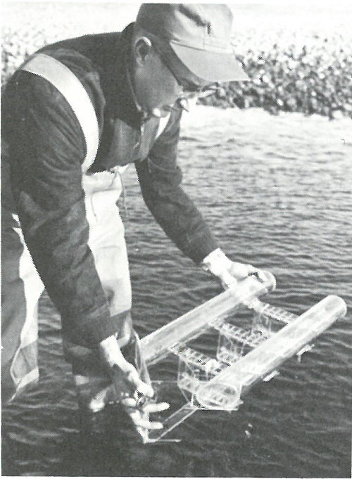 PLANKTON. An ingenious plankton trap is placed in a river as part of a long-range study of radionuclide uptake by aquatic organisms.