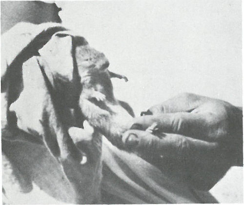 A native rat, captured alive on Engebi Island, being held by a scientist before having its toenails clipped as a means of identification. Note the animal’s healthy appearance.