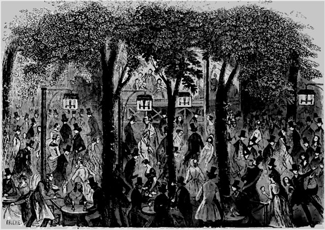 D'autres promeneurs s'engagent dans les étroits sentiers qui serpentent entre les berceaux de feuillage et conduisent par ici à la salle du billard, par là aux jeux de bagues, ou mieux encore au jeu de la rose des dames, et plus loin aux montagnes russes, d'où l'on descend si prestement le coteau de la vie dans une rapide dégringolade. Dix-sept secondes de bonheur, pas davantage; c'est bien court; mais M. Scribe l'a dit, «le bonheur a des ailes!» Et puis on peut recommencer.