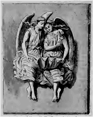 Le dessin de la pendule de M. Paillard est simple et distingué; la base est large et le couronnement gracieux; l'exécution d'ailleurs ne laisse rien à désirer, et nous reconnaissons avec plaisir l'artiste que le jury de 1839 a déjà honoré d'une médaille d'argent. Nous donnons également le croquis d'un bénitier en bronze pour oratoire, exécuté sur les dessins de M. Châtillon. Deux anges, les anges de la prière, appuyés l'un sur l'autre, s'ombrageant de leurs ailes, tiennent entre eux la coquille du bénitier. Ce groupe est calme et recueilli; les vêtements ont l'ampleur suffisante, et sont bien drapés. Nous sommes heureux de donner ici à M. Paillard la preuve que ses produits n'avaient pas échappé à notre attention, et que nous n'attendions que l'occasion de leur donner une mention convenable et méritée.