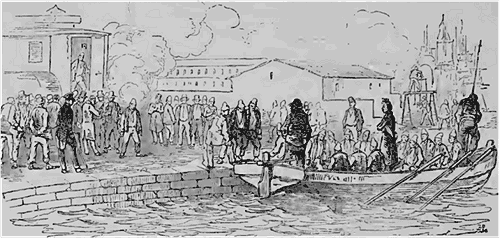 Les places réservées aux nouveaux arrivés occupées, la chaloupe se dirige vers le bagne. Ce sont des forçats qui rament, mais le gouvernail reste confié à un pilote libre. Des gardes chiourmes se tiennent debout entre les condamnés. La chaloupe court rapidement sur les vagues, et bientôt les condamnés pénètrent dans cette prison redoutable, dont la plupart d'entre eux ne doivent plus jamais franchir les limites: Quel moment terrible! frappés dans leur honneur, dans leur fortune, dans leur liberté, dans leur état civil, ils disent un adieu éternel à cette vie du monde maintenant finie pour eux... Est-ce un remords ou le désespoir qui leur cause cette émotion que la plupart d'entre eux essaient vainement de dissimuler?
