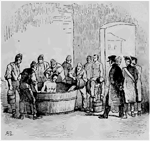 Au sortir du bureau des commissaires, ils sont conduits à la salle de bain. Là, ou les lave dans une cuve en bois; des forçats les frottent avec une grosse éponge, tandis que d'autres vident et remplissent incessamment la cuve d'eau de mer. Des adjudants et des gardes chiourmes président toujours à cette opération, qui ne dure que quelques minutes.