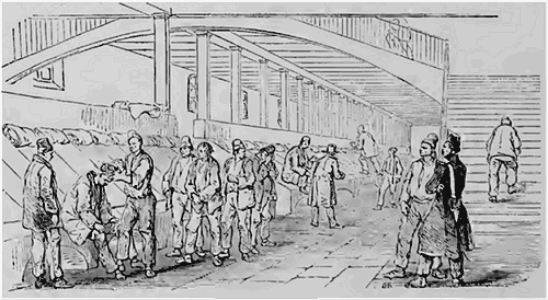 Le jour de leur arrivée, les forçats ne sont pas encore accouplés. On se contente de leur river un anneau à un pied, et on les conduit dans la salle qu'ils doivent désormais habiter jusqu'à l'expiration de leur peine. Ils y restent en général trois jours. Non-seulement ils ne travaillent pas, mais on leur donne une nourriture plus abondante et plus succulente. Ce n'est que lorsqu'on les suppose remis des fatigues du voyage qu'on les accouple et qu'on les contraint à travailler.