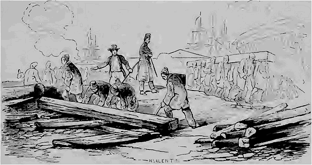 Le dernier dessin que nous publions aujourd'hui représente les forçats employés dans le bagne aux travaux les plus rudes, à retourner des pièces de bois, à les transporter, à les hisser sur les chantiers, etc. Leur zèle a souvent besoin d'être stimulé par des avertissements, quelquefois même par des coups de canne. Leurs travaux sont presque toujours forcés. Aux heures de repas, et quand l'ouvrage manque, les uns s'étendent et dorment à terre, les autres confectionnent ces divers petits ouvrages qu'ils vendent aux visiteurs des bagnes.