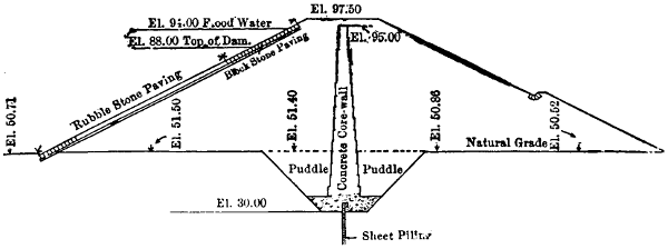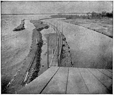 At the bottom of each hole in marsh land a wooden footing 3 feet × 6 inches × 24 inches was laid flat beneath the leg of the tower, and then the hole was filled to within 21⁄2 feet of the surface with the excavated material. Next above this filling comes a galvanized iron gutter-pipe, four inches in diameter, and filled with cement about the leg of the tower for a length of two feet. Outside of this pipe the hole is made rounding full of cement grouting.