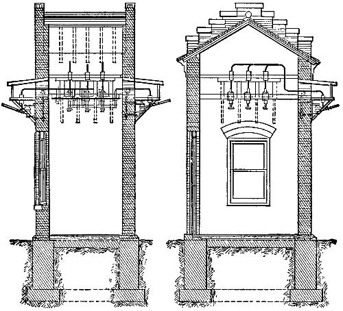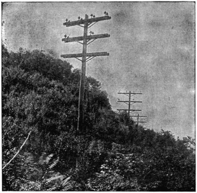 The copper cables were so strung as to have a minimum distance from the ground of 25 feet at the lowest points of the spans. In order to do this the standard steel towers that hold the lower cables 40 feet above the ground level at the insulators are spaced at varying distances apart, according to the nature of the ground between them. At each tower the upper cable of each circuit is 5 feet 3 inches higher than the two lower cables, and this distance between the elevations of the upper and the lower cables is maintained whatever the[325] amount of sag at the centre of each span. If there is a depression between two standard towers on a straight portion of the line, the sag in the centre of a span 400 feet long may be as much as 18 feet. Where a rise and fall in the ground between towers make it necessary to limit the sag to 14 feet in order to keep the lowest cables 25 feet above the highest point of earth, the length of span is limited to 350 feet. If the rise and fall of ground level between towers allow a sag of only 11 feet with the lowest cable 25 feet above the earth, the length of span with 40-foot towers is reduced to 300 feet; and if for a like reason the sag is limited to 8 feet, the span may only be 250 feet.
