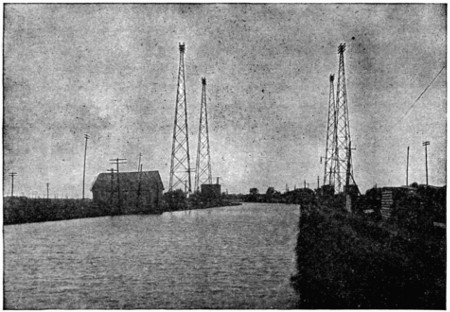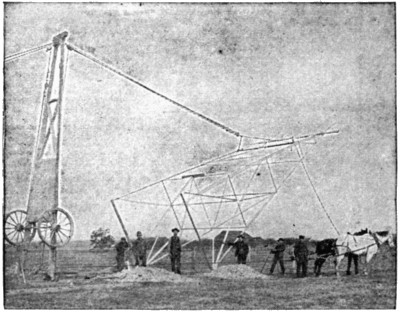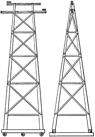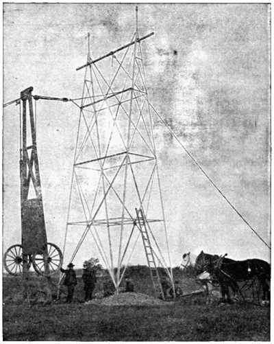 The labor of erecting these steel towers was reduced to a low figure by the method employed, as shown in the accompanying illustration. Each tower was brought to the place where it was to stand with its[318] parts unassembled. For erecting the towers a four-wheel wagon with a timber body about thirty feet long was used. When it was desired to raise a tower, two of the wheels, with their axle, were detached from the timber body of the wagon, and this body was then stood on end to serve as a sort of derrick. This derrick was guyed at its top on the side away from the tower, and a set of blocks and tackle was then connected to the top of the derrick and to the tower at a point about one-fourth of the distance from its top. A rope from this set of blocks ran through a single block fixed to the base of the derrick and then to a team of horses. On driving these horses away from the derrick the steel tower was gradually raised on the two legs of one of its rectangular sides until it came to a vertical position. The next operation was to bring the legs of the tower into contact with the extension pieces that were fixed in the earth and then bolt them together.