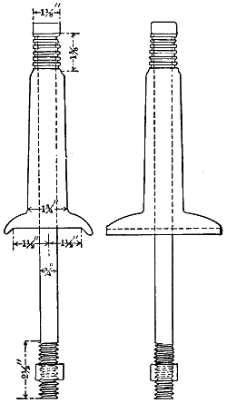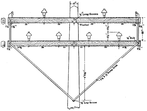 The tops of the three pins that carry the insulators for each three-phase circuit are at the corners of an equilateral triangle (Fig. 100), each of whose sides measures six feet. The six steel insulator pins used on each tower are exactly alike, and each is swaged from extra heavy pipe. Each finished pin is 23⁄8 inches in diameter for a length of 31⁄4 inches, and then tapers uniformly to a diameter of 11⁄8 inch at the top through a length of 111⁄2 inches. This gives the pin a total length of 143⁄4 inches. In the larger part there are two 9⁄16-inch holes from side to side, and within two inches of the top there are three circular grooves each 3⁄16 inch wide and 1⁄16 inch deep. Forged steel sockets of two types are employed to attach the steel pins with the pipes. Each socket is made in halves, and these halves are secured to both the pipe and the pin by through bolts. Like all other parts of the towers, these steel pins and[319] sockets are heavily galvanized. On each of the four corner bars of a tower the lower six feet of its length is secured to the upper part by bolts or rivets. This lower six feet of each corner bar is embedded in the earth, and the construction just named makes it easy to replace the bars in the earth when corrosion makes it necessary.