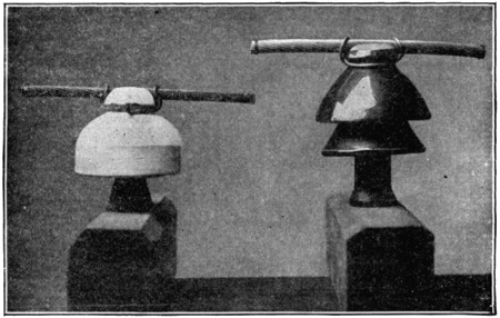 Insulators for the transmission line, which are illustrated in Fig. 104, are of brown, glazed porcelain, made in three parts, and cemented together. The three parts consist of three petticoats or thimbles, each of which slips over or into one of the others, so that there are three outside surfaces and three interior or protected surfaces between the top of an insulator and its pin.