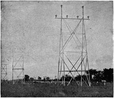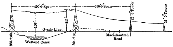 At some points along the line conditions require a span between towers of more than 400 feet, the regular distance for straight work. One example of this sort occurs at Twelve-Mile Creek, where the stream[314] has cut a wide, deep gorge in the Erie plateau. At this point the lines make a span of 625 feet between towers.