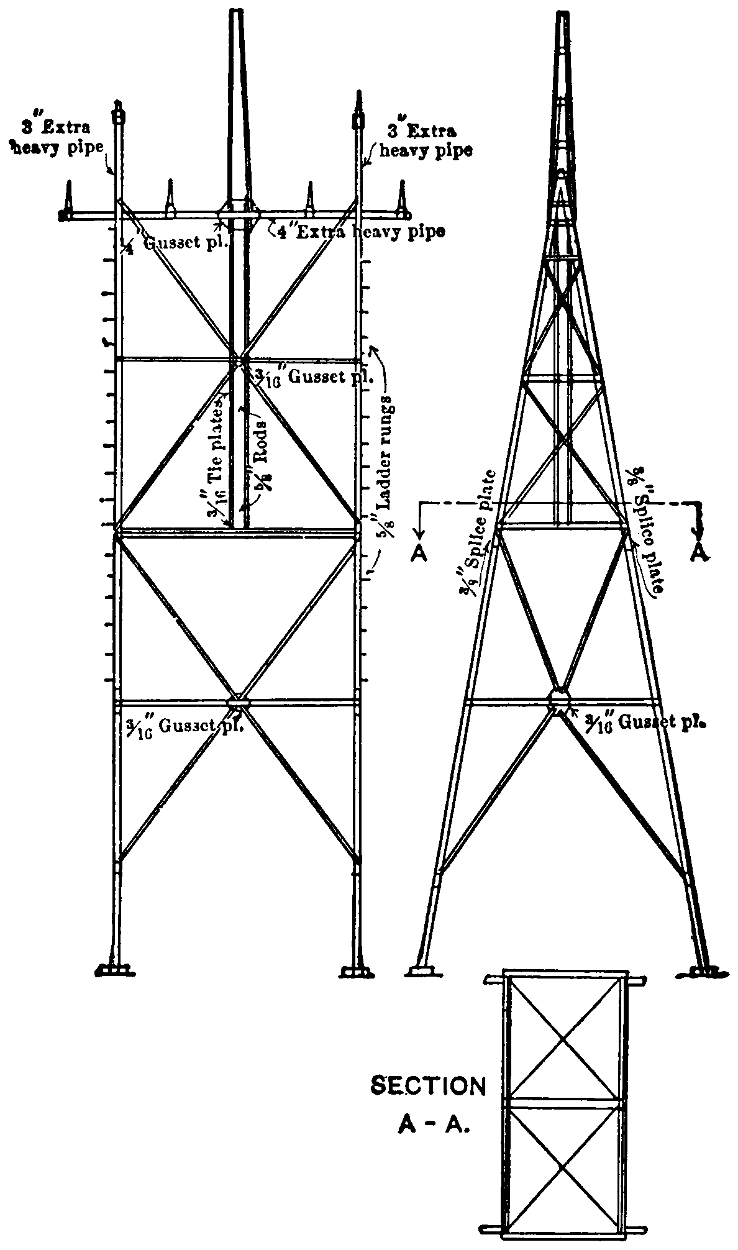 The regular steel tower used in this transmission measures 46 feet in vertical height from its foot to the tops of the lower insulators, and 51 feet 3 inches to the tops of the higher insulators. The lower six feet of this tower are embedded in the ground, so that the tops of the insulators measure about 40 feet and 45 feet 3 inches respectively above the earth. At the ground the tower measures 14 feet at right angles to the transmission line and 12 feet parallel with it. The width of each tower at the top is 12 feet at right angles to the line, and the two sides having this width come together at points about 40 feet above the ground. Between the two L bars thus brought nearly together, at each side of a tower a piece of extra heavy 3-inch steel pipe is bolted so as to stand in a vertical position. Each piece of this pipe is about 31⁄2 feet long and carries a steel insulator pin at its upper end. The two pieces of pipe thus fixed on opposite sides of the top of a tower carry the two highest insulators. For the other four insulators of each tower, pins are fixed on a piece of standard 4-inch pipe that serves as a cross-arm, and is[315] bolted in a horizontal position between the two nearly rectangular sides of each tower, at a point two feet below the bolts that hold the vertical 3-inch pipes, already named, in position. Save for the two short vertical and one horizontal pipe, and the pins they support, each tower is made up of L-shaped angle-bars bolted together. Each of the two nearly rectangular sides of a tower consists of two L bars at its two edges, three L bars for cross-braces at right angles to the edges, and four diagonal braces also formed of L bars. The lower halves of the L bars at the edges of each side of a tower have sections of 3″ × 3″ × 1⁄4″, and the upper halves have sections of 3″ × 3″ × 3⁄16″. This last-named cross-brace and the other two cross-braces have a common section of 2″ × 11⁄2″ × 1⁄8″. For the lower set of diagonal braces the common section is 21⁄2″ × 2″ × 1⁄8″, and the upper set has a section of 2″ × 11⁄2″ × 1⁄8″ in each member.[316] At the level of the lowest cross-braces the two rectangular sides of a tower are tied together by one member of 2″ × 11⁄2″ × 1⁄8″ of L section and at right angles to the sides, and by two diagonal braces of 5⁄8″ round rod between the corners of the tower. On each of its two triangular sides a tower has four horizontal braces and three sets of diagonal braces. The two upper horizontal braces are of 2″ × 11⁄2″ × 1⁄8″ L section, and the lowest is the same, but the remaining horizontal brace has a section of 21⁄2″ × 2″ × 1⁄8″. Bars of 2″ × 11⁄2″ × 1⁄8″ L section are used for the two upper sets of diagonal braces, and bars of 21⁄2″ × 2″ × 1⁄8″ for the lower set. In addition to the cross-braces named, each triangular side of a tower near the top of the corner bars has two short cross-pieces with the common L section of 31⁄2″ × 31⁄2″ × 5⁄8″, one just above and the other just below the cross-arm of 4-inch pipe to hold it in place. At the bottom of each of the four corner bars of a tower a foot is formed[317] by riveting a piece of 3″ × 1⁄4″ L section and 15 inches long at right angles to the corner bar. On one corner bar of each tower there are two rows of steel studs for steps, one row being located in each flange of the L section. On the same flange these steps are two feet apart, but taking both flanges they are only one foot apart. Every part of each steel tower is heavily galvanized.