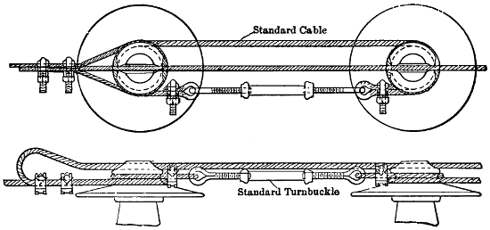 At each terminal tower, where the cables are secured before they pass into a terminal-station, the three insulators for each cable are in a straight line with their centres, 30 inches apart. When a line cable reaches the first insulator of the three to which it is to be attached on one of these towers, it is passed around the neck of this insulator and then secured on itself by means of two clamps that are tightened with bolts and nuts. See Fig. 105. The cable thus secured turns up and back over the tops of the three insulators and goes to the terminal-station. Around the neck of the insulator to which the line cable has been secured in the way just outlined a short detached length of the regular copper cable with the parts of a turnbuckle at each end is passed, and this same piece of cable also passes around the neck of the next insulator in the series of three. By joining the ends of the turnbuckle and tightening it, a part of the strain of the line cable in question is transferred from the first to the second insulator of the series. In the same way a part of the strain of this same line cable is transferred from the second insulator of the series to the third, or one nearest to the terminal-station.