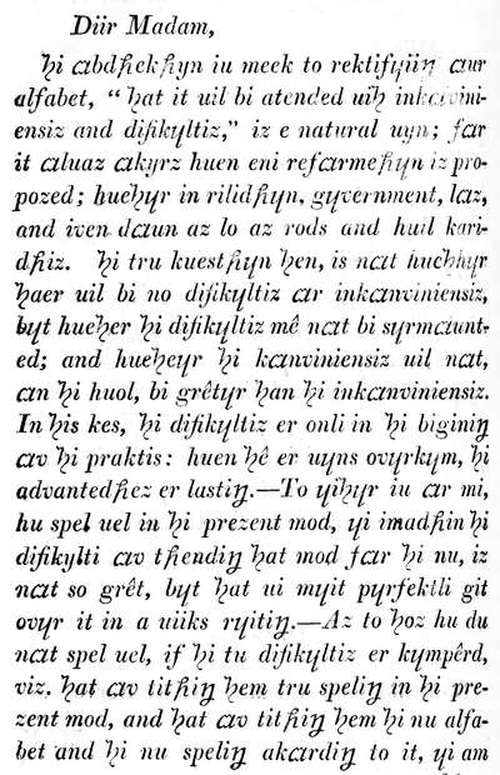 Several pages of the book contain a description and examples of a modified alphabet proposed by B.F. There are six new characters in his alphabet; these, and the example text using them (pages 360-366 in the original book) are shown as images in this ebook.