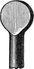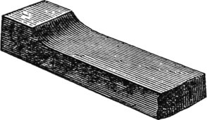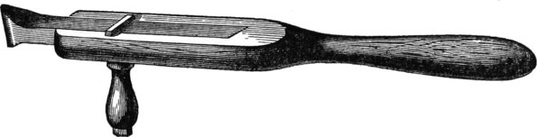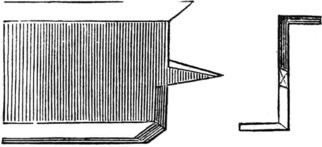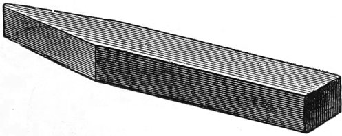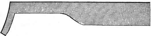 A very convenient tool for inlaying veneers edgewise, so as to produce alternate dark and white lines is made by taking a piece of steel, one fourth of an inch by one sixteenth thick, and making a chisel, like Fig. 73. The bottom is rounded to prevent it from digging in. To use this tool, or to inlay fine white and black lines, or white lines alone, all over the surface of any piece of wood in any pattern desired, it is only needful to mark out the pattern first, incise it all around with a sharp keen edge, such as a knife blade broken off to form a square end, and then follow the lines with this tool, when the wood will come away, leaving a clean channel, in which the veneer may be inserted with expedition and neatness. In crossing the corners, it is necessary to use caution, so that they be not broken away, for no inlaying looks well if chipped, or ragged at the edges. This is especially convenient for drawing lines across mahogany boxes that have been put together before inlaying was thought of for them. The veneers should all be glued together, side and side first, that is, if two colors are used, then they will fit on the ends properly, and may be handled with more expedition.