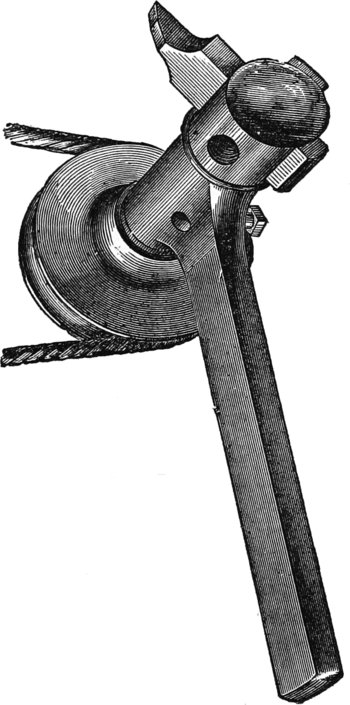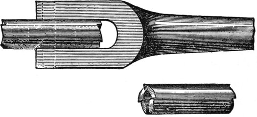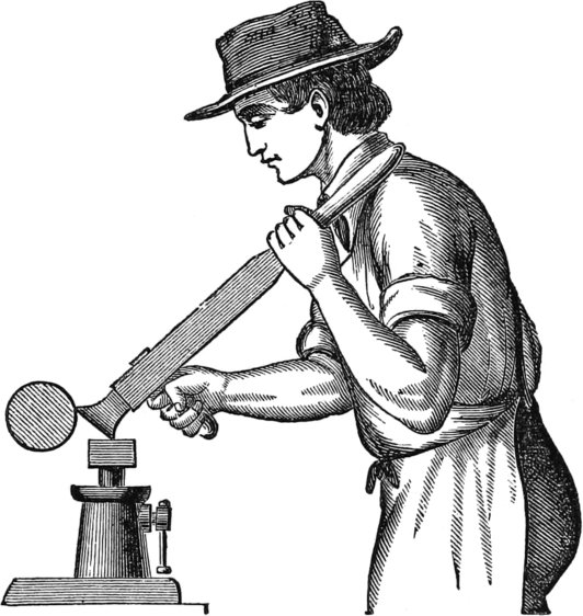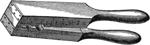 In some shops, there are still standing heavy oaken shears, made of timber twenty inches deep, and four or six inches wide, faced with boiler iron, and in the racks above there are long-shanked tools, with which the men of old were wont to do the work.
