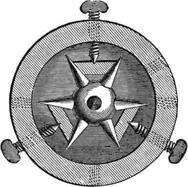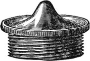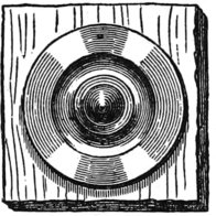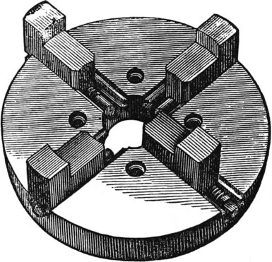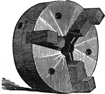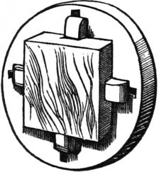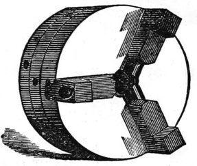 It is not necessary to mention what kinds of work can be done, for that will occur to every one, but I will merely give here an illustration of the facility which the chuck affords for all kinds of work. Fig. 57 is a box cover, and being held at first by the corners, permits the inside to be turned out to fit the bottom. Afterwards, whatever finish or pattern is desired, can be given to the top. There is in every lathe, a center screw, like Fig. 58, which is useful for holding work that has, or is to have, a hole in it, but for fine work it is not suitable, for the obvious reason that the screw spoils it. Fig. 57 is the scroll chuck, and is a favorite instrument of mine. I could dispense with many things—the face-plate of the lathe for one—better than I could with this. If I want to make a sleeve-button, there is my friend, the scroll chuck, ready to hold the piece true to the center, without any adjustment whatever and hold it firmly, too. If I wish to bore out a ring, the chuck will grasp true, and hold it without spring: in fact, not to dilate unnecessarily, I call it the one thing no turner can afford to be without. There are many in the market, but the best one for general work of this class, I have found to be that made by A. F. Cushman, of Hartford, Connecticut. He makes a very small chuck, also, for holding drills, that is exceedingly convenient for them, and for holding screw wire, or any work of that class. The “Beach Chuck,” made by the Morse Twist Drill Company of New Bedford, Massachusetts, is also a good chuck, but as I am not now discussing the merits of chucks, I will return to the subject in hand—treatment of woods.