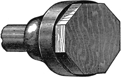 In turning wood, the speed cannot be too high, or the tool too sharp. The faster the speed, the more perfect the surface produced by the tool. In centering, also, it is necessary to use care in getting a sound place to begin on; otherwise, when in the middle of a job, the centers change and the work is spoiled. This, of course, relates to work that is turned on centers, such as chess-men, penholders, rulers with ornamental ends, “what-not” legs; in fact, anything of that class. The driving center or one that goes in the head of the lathe, commonly called the live center—in opposition to the one in the back end of the lathe head, which does not move, and is called the dead center—should be properly made, or much confusion will be the result. Very many use the common bit, like Fig. 54, which is a very poor device for the purpose. There being no guard at the corners of the bit, they are liable to slip when strain is brought on the work by the tool; it is, therefore, necessary to make the driving bit, or center, like Fig. 55, which represents a section through the front edge and the flat pieces at the top, to prevent the work from slipping.