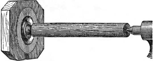 In turning very small work, say penholders for example, I have found centers useless to drive from, and after trying dogs, commonly used for metal turning, and many other devices, have found no more efficient or expeditious plan than to round the end of the wood slightly with a pocket-knife, as in Fig. 56; insert the rounded end in a chuck, and place the other in the back center. In this way, I am able to command the whole range of the work, from end to end, without interference, and to have the small tip where it is necessary to have it to keep steady; that is, near the center.