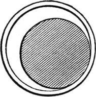 Fig. 77 is still another pattern, but what is shown dark, as at A, in the outer circles should be light to represent tulip wood. Tulip contrasts splendidly with ebony. The center or body of the cover should be rosewood. This must be put on first, all over the whole surface, and a white holly ring put on the outside edge. The exterior and interior circles, which form the pattern, are then cut out by a tool like a carpenter’s bit used in the lathe, as in this diagram. The letter a is round, and will, of course, make a slight center hole in the box cover, but as it is covered up that is a matter of no moment. The inner circles B should also be tulip, or some wood that contrasts with ebony; mahogany is very handsome. This pattern is not pretty, but it is striking and unique, which is sometimes the same thing. Of course, the distances of the circles must be determined beforehand with a pair of compasses.