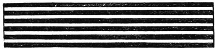 I do not saw off each square strip by itself before I glue the stock, but I lay up several flat pieces, as in Fig. 69, which represents one end section of the strips, longer than it is high, the saw removes some in cutting, so that when I saw down through the top vertically, as shown by the straight line A, I obtain square strips in long pieces, but all glued together so they are easy to handle, these I afterward glue together again, so that white and black alternate, as in the checker-board, and I then have the pattern precisely uniform in all the length of the stock. I claim originality for this plan, and also expedition in execution; more than either I get entire uniformity. Of course it is easy to make any other pattern in the same way, and it is surprising to see how many rectangular and acute-angled patterns can be made with these sections. It is sometimes possible to get veneers of the right thickness, but any veneer cutter will saw the wood as desired.