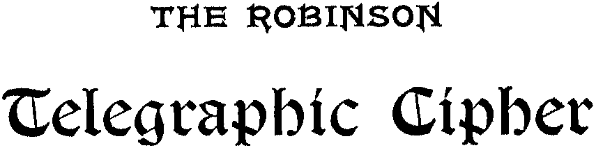The Project Gutenberg EBook of Robinson Telegraphic Cipher, by S. L. Robinson This eBook is for the use of anyone anywhere in the United States and most other parts of the world at no cost and with almost no restrictions whatsoever. You may copy it, give it away or re-use it under the terms of the Project Gutenberg License included with this eBook or online at www.gutenberg.org. If you are not located in the United States, you'll have to check the laws of the country where you are located before using this ebook. Title: Robinson Telegraphic Cipher Author: S. L. Robinson Release Date: February 11, 2015 [EBook #48232] Language: English Character set encoding: ISO-8859-1 *** START OF THIS PROJECT GUTENBERG EBOOK ROBINSON TELEGRAPHIC CIPHER *** Produced by Charlene Taylor, Fox in the Stars, Keith Edkins and the Online Distributed Proofreading Team at http://www.pgdp.net