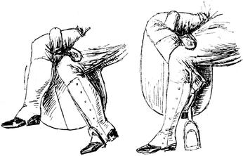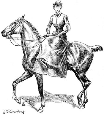 »Einem unvoreingenommenen Auge«, sagt die Verfasserin, »muß eine Reiterin im Quersitz (der Herrensitz ist gemeint!) gefälliger erscheinen, denn wenn man imstande ist, von der Gewöhnung zu abstrahieren und den Anblick, den sie im Damensattel bietet, ganz objektiv zu erfassen, so muß man diesen fast von allen Seiten für direkt unschön erklären. Von vorne wie von hinten gesehen, hat die Figur von Pferd und Reiterin eine unglückliche Kontur. Man sucht ängstlich, wo wohl der Schwerpunkt dieser Unform sich befinde; nicht ganz so schlimm ist es von der rechten, am erträglichsten von der linken Seite (na also!), zeigt uns aber der Zufall die Rückansicht einer »englisch« trabenden Dame, so fühlen sich Ästhetik und Anstandsgefühl in gleicher Weise gekränkt (na na!) und alle Grazien verhüllen entsetzt das Haupt. Hierbei ist natürlich nur das anerzogene Anstandsgefühl gemeint, das die Existenz bestimmter Körperteile, die es hier besonders zum Ausdruck gebracht sieht, nun einmal ignoriert wissen will. (Und unsre heutige Damenmode???)«