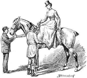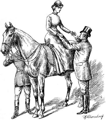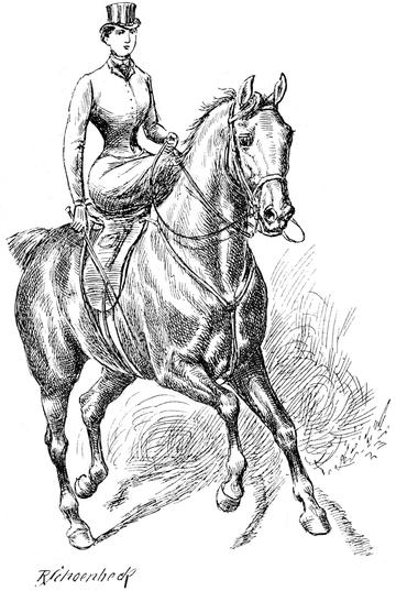 Die Dame, welche zum Vergnügen reitet, wechselt gern ihre Pferde. Sie kümmert sich wenig darum, ob das Pferd, auf welchem sie sitzt, sie »zur Geltung« bringt, – sie denkt nur daran, ihr Pferd zur Geltung zu bringen. Es ist ihr gleichgültig, wenn man sagt: »Ich bin heute Frau F. auf einem Pferde begegnet, das ihr vorzüglich steht; sie war noch hübscher als gewöhnlich«. Aber sie ist vor Freude außer sich, wenn sie im Vorbeireiten die Bemerkung hört: »Ich weiß nicht, wie es Frau F. macht, aber dieser Schinder sieht nach etwas aus, wenn sie darauf sitzt.«