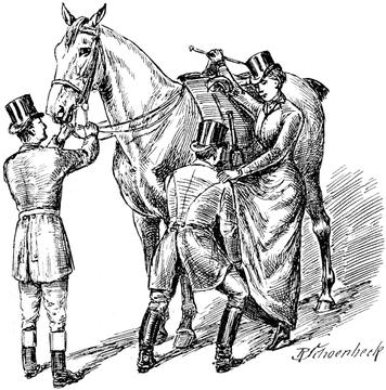 Bevor eine Dame sich dem Rücken des Pferdes anvertraut, sollte sie sich darüber klar sein, in welcher Art und Weise sie reiten will, allerdings eine Vorbedingung, welche seit mehreren Jahrhunderten kaum zur Frage geworden ist. Aber die Emanzipierungsbestrebungen der Damen in neuerer Zeit auf allen Gebieten hat auch auf diesem eine Propaganda gezeitigt, welche nicht unbeachtet vorübergehen konnte, und ich halte es demnach für notwendig und meine Pflicht, diese Frage etwas eingehender zu erörtern.