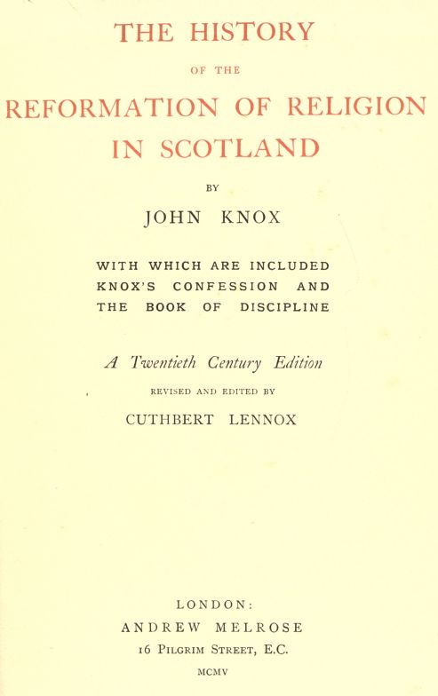 The present edition is a serious attempt to remove the obstacles to which we have just referred. The editor has not bound himself to reproduce the ipsissima verba of Knox[viii] at every point; although quotations from documents have been transliterated with some exactness. His main object has been to make Knox's book utterly readable, and it may be claimed that the complete historical narrative is now given to the English reader. Here and there a parenthesis has been dropped, here and there a "meary tale" which carries the illustration of the argument a little further than modern ideas of decorum permit. Essential clauses of letters and other documents have been retained: nothing is omitted that will substantially further the high purpose of the history. The Confession of Faith, commonly known as Knox's, and The Book of Discipline were reckoned too important for abridgment. These have been transferred bodily to the Appendix, to avert a serious block in the narrative.