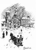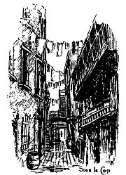 A charm and a glamor hangs over the generally commonplace business of buying and selling, getting gain and making provision for the humble needs of the day. The whole thing seems like a picture-book. The groups of voluble, good-humored habitant women; the queer little carts like ladders mounted on wheels; the small pink pigs, squealing their hardest as they are transferred from the crates of the vendors to the sacks of the purchasers; the background of tall, irregular buildings climbing the great cliff—these lend to the scene a color and character all its own.