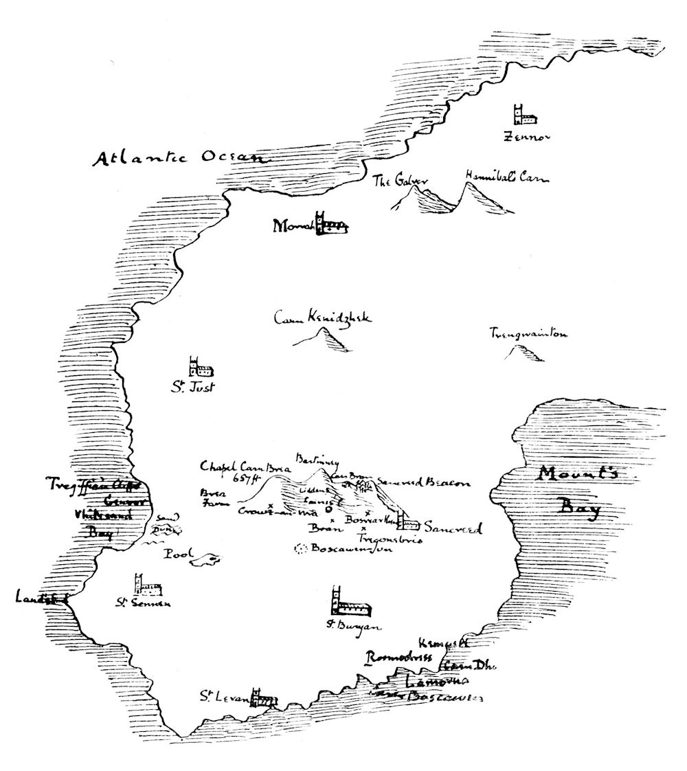 The Cornish Heights terminate near the Land’s End in four wild hills of singular charm, though of very modest altitude. Springing as they do from a treeless tableland, they look quite like a miniature mountain range, especially when seen through rolling mists or capped by the rain-laden clouds which, like birds coming weary from the Atlantic, settle on their summits. Man seldom intrudes there, though they offer a peerless prospect over promontory and ocean. The faint paths amongst ling and furze are not his: they have been traced by the foxes that kennel on this silent retreat, or by badgers going to and from the deep sett on the northern slope; for the desolate upland has long been given over to the outlawed creature, and furnished sanctuary to any wildling that sought it.