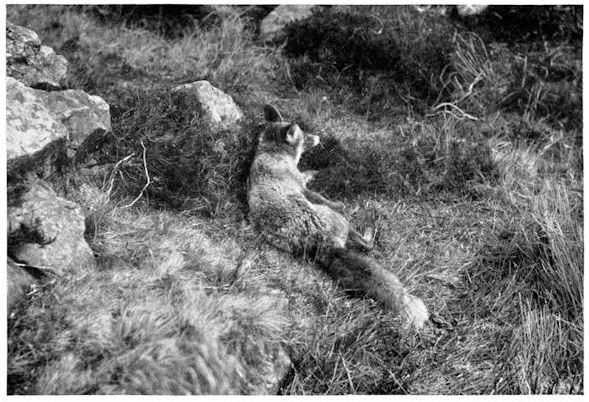 Four days passed without disquieting incident, but on the fifth the vixen paid a visit to the hill and threw the hare into a fever of anxiety. The daring marauder came at high noon, during the farmer’s dinner-hour, when the land is forsaken and the peace of the waste spreads to the fields, enticing the nocturnal prowler to venture forth in broad daylight in search of food. Thus lured, the vixen, yielding to the importunities of her hungry cubs, stole from her earth and, keeping to the overgrown ditches, gained the boundary wall without exposing herself to view. But the instant her mask showed above the coping-stone the hare espied her, and from that moment followed every movement. She thought that the fox knew of her presence and was in search of her, as well as she might, for the hill harboured no prey save herself and her young, at least none worth the coming for. So while the vixen searched the lower slopes the hare watched with eyes starting from her head, anxious to learn whether the murderous creature would hit the line she had left at early dawn. Once she crossed it without checking; she flashed over it again near the Giant’s Bowl, and then the hare knew that the trail would not betray her; the hot sun had evaporated every particle of what little scent she had left.[1] The hunter moved at an unusually quick pace, as if she had set herself the task of examining the whole hillside during the short time that man remained within doors. Now she threaded the bushes, now she leapt them; once she was lost to view in a patch of tall furze gorgeous with blossom, but in a few seconds she reappeared at the far end to continue the quest in the open. At last near the black shadow cast by a boulder she stopped, assumed a listening attitude, then plunged her long nose into a bush after a mouse, but apparently without getting it, for she did not lick her chops. Nothing disconcerted, however, on she went again, ranging to and fro without a pause till, half-way up the slope, she stood suddenly still and looked towards the homestead as if all at once alive to the risk she was running. A glance satisfied her that man was still indoors, and again she resumed the quest, if possible with greater keenness than before. Every stride now was taking her dangerously nearer and nearer to the hare, but whilst she was yet some five or six rods below the form a sheep-dog barked, and in an instant she was transformed from a lithe hunter into a craven creature. Crouching, she fixed her gaze on the dog expressing his delight at the reappearance of his master, who stood in shirt-sleeves at the open door. “Down, Shep.” At the sound of the man’s voice the vixen sank into the herbage as if turned to lead, and remained there motionless, save in heaving flank and lolling tongue. Presently the farmer withdrew; the vixen slunk down the hill, carefully avoiding the exposed places, climbed the wall, and vanished from sight.