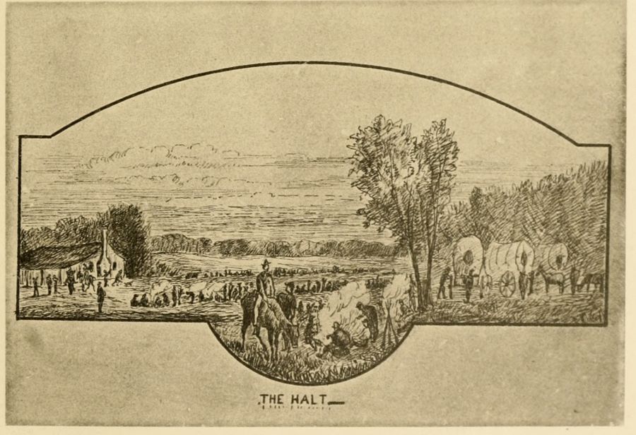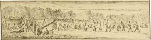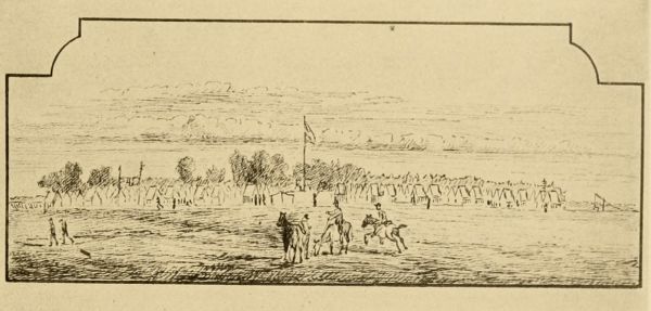 We found that the pioneers had been at work during our absence, and the camp was already laid out in streets, and some of the tents pitched. They were A tents, eight feet square, and intended for four occupants, though owing to the liberal supply many had but three; however, no one was ever heard to complain of a superabundance of room. Sunday was anything but a day of rest, for, immediately after service, there was a general stampede for the deserted camps near by, to obtain flooring for the tents and materials for stockading them.