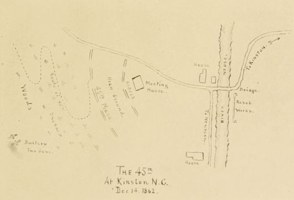 On arriving in town, it appears that the expedition consists of the first division of infantry, accompanied by a small force of cavalry and artillery, the destination being somewhere in the direction of Kinston. The Forty-Fifth meets with its usual good luck, for our brigade is embarked on the cars, with orders to proceed by rail as far as the track will allow, thereby saving us a march of some eighteen miles, which the other brigade is compelled to make. The whole force was under the command of General Palmer.